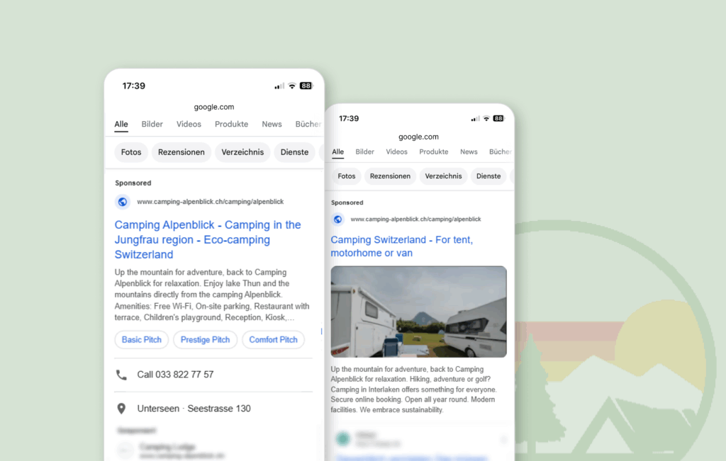 Für jeden Campingplatz entstanden individuell ausgearbeitete Anzeigen, die saisonale Besonderheiten und Zielgruppenbedürfnisse gezielt aufgriffen. Angebote wie „5 Nächte buchen, 1 Nacht gratis“ oder „Hund übernachtet gratis“ sorgten für hohe Relevanz und weckten direktes Buchungsinteresse.