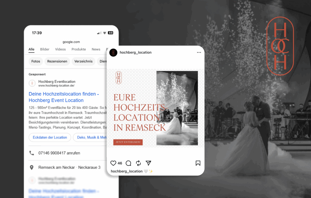 Die Suchkampagnen wurden auf Keywords wie „Hochzeitslocation Ludwigsburg“ oder „Catering Remseck“ zugeschnitten. Durch kontinuierliche Anpassung der Anzeigentexte, Verfeinerung der Keyword-Strategien und Bidding-Optimierungen konnten Reichweite, Klickzahlen und Conversion-Rates deutlich gesteigert werden.