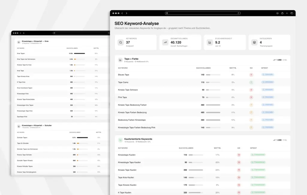 Um eine belastbare Grundlage für die organische Sichtbarkeit von KINGTAPE zu schaffen, starteten wir zunächst mit einer umfassenden Keyword-Recherche. Dabei wurden relevante Suchbegriffe sowohl für die einzelnen Produkte als auch für die übergeordnete Themenwelt identifiziert, um sicherzustellen, dass alle potenziellen Nutzeranfragen abgedeckt werden.